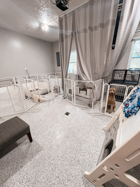 Our mom dogs are given the utmost care in all areas of their lives. They receive top notch regular grooming, premium nutrition such as Open Farm and Nutrisource, regular vet care at one of the most premier animal clinics around, Animal Clinic Northview and their team of reproduction specialists. They are members of the family first and foremost. During whelping we give them whatever they need, whether that means they have us by their side the entire duration of delivery, need some space, need more assistance, would require a c section, or whatever is deemed most important for their overall health. They are given their own private space with comfy bedding, dim lights, and this ensures they feel safe bringing those sweet puppies into this world. It doesn't stop once the pups are born, they receive meals in the whelping box, daily tail and belly baths to ensure cleanliness, premium vitamins, daily temperature and mastitis checks, and an overall relaxing environment.